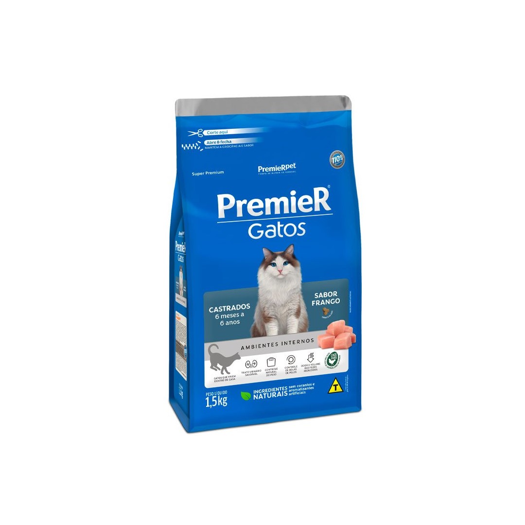 RAÇÃO PREMIER GATOS CASTRADOS 6 MESES A 6 ANOS FRANGO Tamanho:1,5KG
