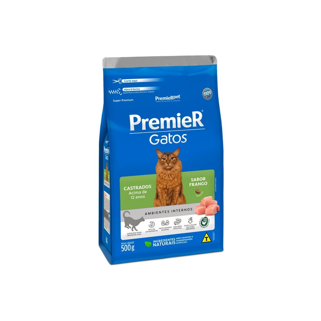 RAÇÃO PREMIER GATOS CASTRADOS + DE 12 ANOS Tamanho:500G