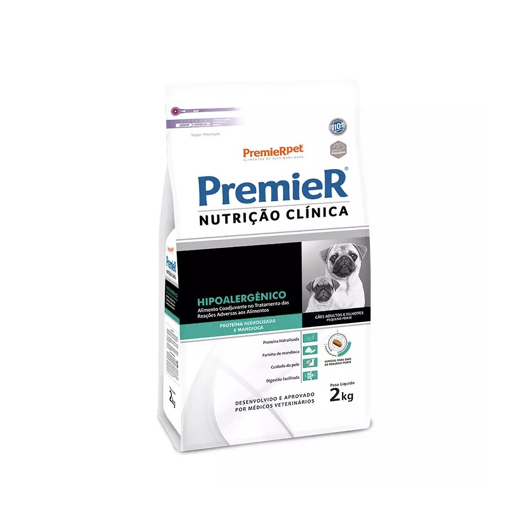 <p>PremieR Nutrição Clínica Hipoalergênico Proteína Hidrolisada e Mandioca é um alimento auxiliar para o tratamento de cães adultos e filhotes com reação adversa ao alimento que apresente sintomatologia dermatológica e/ou intestinal | Além do acompanhamento realizado pelo médico veterinário, é fundamental substituir a dieta por um alimento com menor potencial de causar alergia, reduzindo assim a possibilidade de ocorrência dos sintomas | Os objetivos da dieta são: através de uma fonte de proteína hidrolisada reduzir a reação adversa ao alimento, cuidado da pele por meio de níveis elevados de ácidos graxos ômega 3 e 6 e zinco, além disso, proporcionar uma digestão facilitada e oferecer uma fonte exclusiva de carboidrato (farinha de mandioca) | Este alimento deve ser utilizado sob orientação e prescrição de um profissional. Recomenda-se o uso por um período mínimo de 3 a 8 semanas. Se os sinais desaparecerem, este alimento pode ser utilizado continuadamente.</p>